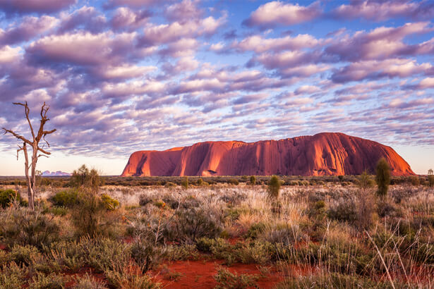 Image emblématique de l’Australie, cet imposant rocher aux teintes rouges émerge spectaculairement au milieu du désert, à 300 km d’Alice Springs. © Maurizio De Mattei / Shutterstock