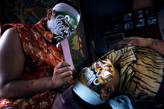 La Guanjiang Shou est une des troupes traditionnelles les plus populaires de Taïwan. C’est à Taichung à Taiwan que Chan Kwok Hung a photographié ces deux policiers de la pègre ou gardes du corps des Dieux.