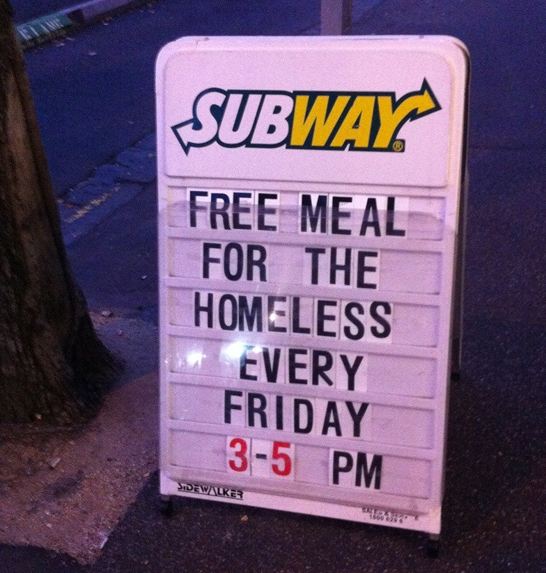Même une enseigne aussi commerciale que Subway, pourtant un prototype de marque mondiale pilotée par des controleurs de gestion, est capable de gestes désintéressés. Pour preuve, cette offre de repas gratuit pour tout SDF. Merci pour eux.