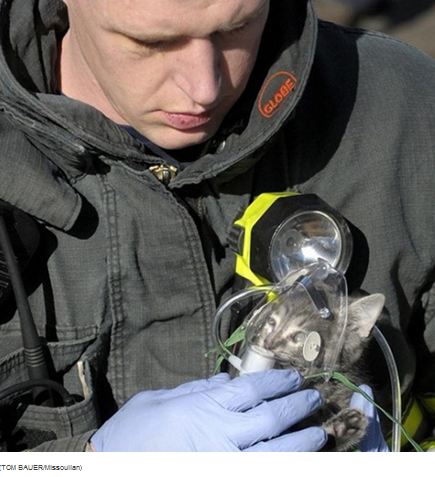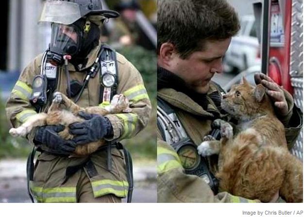 Et celle-ci : même les pompiers aident les animaux. Un peu d’oxygène pour ce chat asphyxié par un incendie.