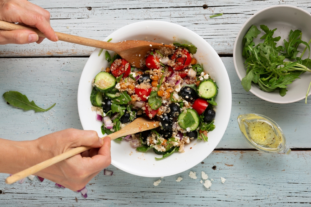 Préparation : Faites cuire le quinoa selon les instructions de l’emballage, puis laissez-le refroidir. Coupez la courgette, le poivron et la tomate en petits dés, puis mélangez-les avec le quinoa. Arrosez d’huile d’olive et de jus de citron, puis assaisonnez avec le sel et le poivre. Ajoutez quelques olives noires.