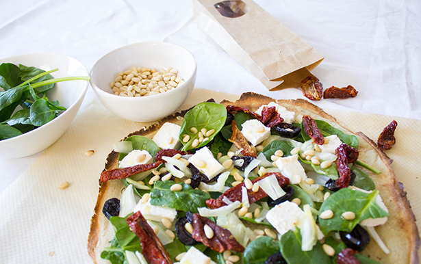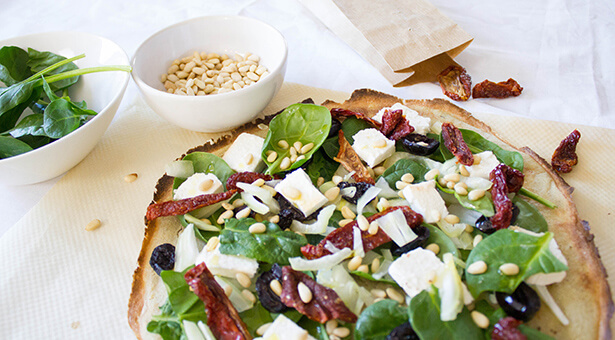 Dans un moule à gâteau, disposez du papier sulfurisé et placez-y la pâte à quinoa. Enfournez pour 10 à 15 minutes, retournez la pâte à mi-cuisson. Vous devez obtenir une base croustillante et légèrement dorée. Retirez du four et ajoutez votre garniture. Remettez au four pendant 5 minutes : c’est prêt !