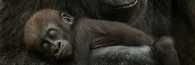 Photo de bannière : jeune gorille dans les bras de sa mère, Apenheul zoo, Pays-Bas © WWF