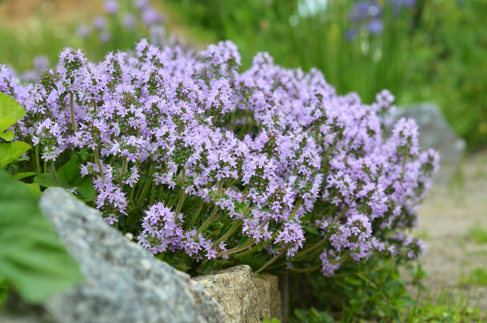 Autre plante vivace faisant office d’excellent couvre-sol : le thym rampant, qui offre des fleurs roses ou blanches pendant toute la saison estivale. Très résistant, le thym rampant peut pousser dans différents types de sols, même pauvres et calcaires. Il préfère cependant les endroits ensoleillés et secs. Le thym rampant peut être planté à n’importe quelle période de l’année, bien qu’il soit préférable de le planter en automne ou au début du printemps. Il est très résistant à la sécheresse et ne nécessite pas beaucoup d’arrosage. Taillez régulièrement un thym rampant lui permettra de demeurer compact.