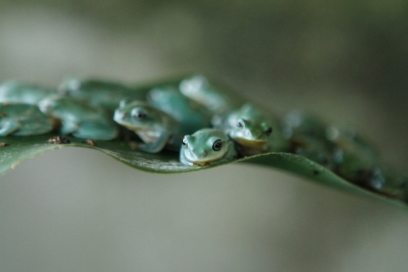 De petites grenouilles vertes d’Arbre sont tranquillement posées sur une feuille dans un camp destiné aux amphibiens et leur alimentation. Le premier camp de ce genre au Vietnam a été ouvert en 2004 dans le but de promouvoir l’environnement, la conservation des espèces, mais aussi leur exportation.