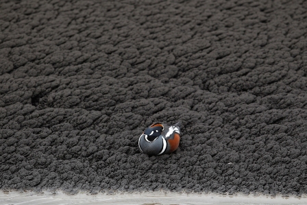 Si les éruptions de volcans laissent souvent des paysages désertiques, cette photo nous montre un canard coloré posé tranquillement sur les cendres d’un volcan, en Islande.