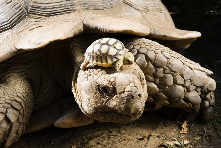 Une tortue terrestre Geochelone sulcata de quatre jours prend un petit bain de soleil sur la tête de sa mère, dont la taille est très impressionnante. Le cliché a été pris en Hongrie, dans le parc de Nyiregyhaza.