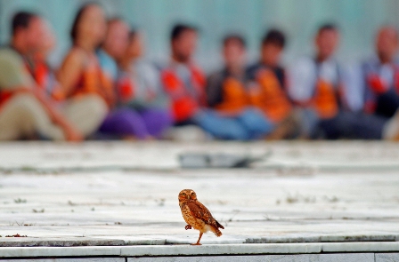 Image amusante d’une petite chouette semblant prendre la pause au Brésil. En fond, on devine des individus : des activistes de l’organisation Greenpeace. Cette photo a été prise au Brésil.