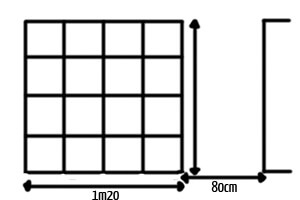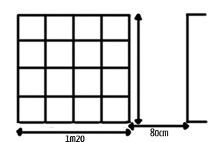 On va donc commencer par un grand carré, ou plus si vous le souhaitez, de 1,20 m x 1,20 m. Ce grand carré va être divisé en 16 plus petits carrés de 30 cm x 30 cm.