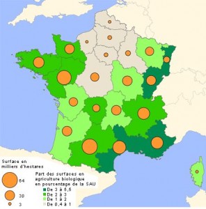 - En 2009, l’agriculture biologique ne représentait que 2,46 % de surface agricole en bio et environ 2,9 % en 2010 : un taux très faible face à l’agriculture conventionnelle,