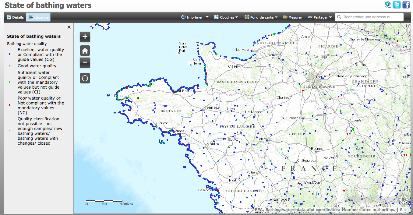 L’AEE propose une carte interactive qui permet de voir l’historique de 2004 à 2014 de l’état de chaque lieu de baignade en Europe qu’elle surveille (en anglais).