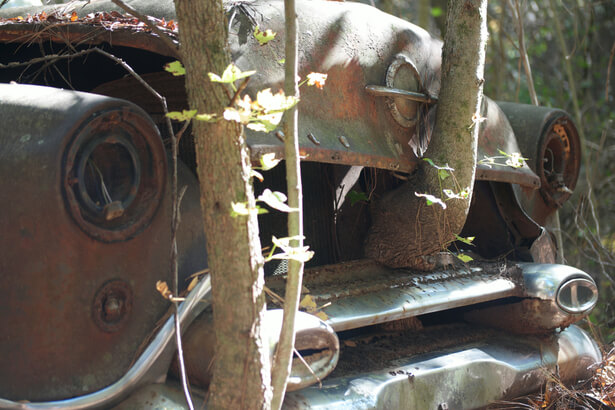 Voici le genre de belles photos d’automobile : lorsqu’un arbre pousse dans une carcasse de voiture et que ses ramifications sortent du moteur.