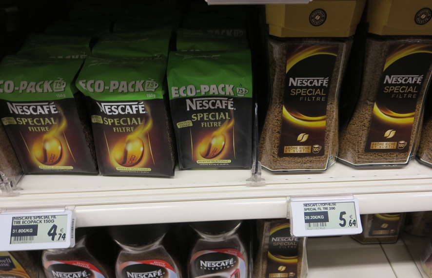 Parmi les gestes les plus évidents à adopter quand on fait les courses, afin de ne pas gaspiller, il y a celui de choisir des écorecharges. Les écorecharges nous sont présentées comme étant une manière d’économiser. Hélas l’économie ne va pas toujours dans la poche de celui auquel on pense. Démonstration d’Olivier Dauvers dans un hyper avec les écorecharges de Nescafé.