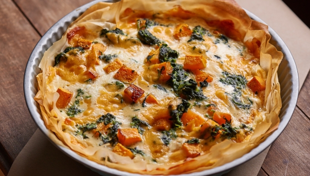Cette quiche se distingue par sa combinaison harmonieuse de la douceur du potiron et de la fraîcheur des épinards.