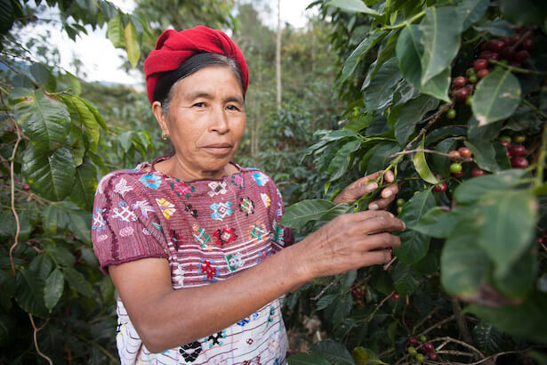 Candelaria Jeronimo Morales récolte des cerises de café dans sa ferme au Guatemala © Fairtrade International / Sean Hawkey