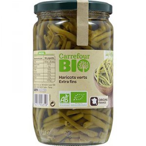 Sur ce lot de haricots verts extra-fins de la marque Carrefour Bio, de petits bouts de verre ont été retrouvés dans quelques bocaux de 370 ml. Sans doute un problème survenu lors de la mise en pot des légumes. Les haricots en question sont produits par la Compagnie générale de conserve (CGC).