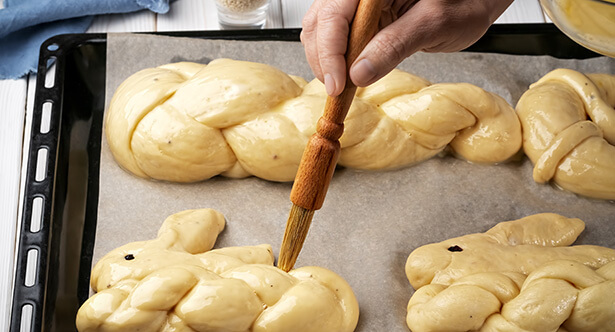 - Après levée, on récupère la pâte et il s’agit alors de former la brioche. Farinez une plaque de cuisson. Saisissez la pâte et séparez-là en trois parties. Formez alors trois boudins d’un diamètre et d’une longueur équivalente. Utilisez ces boudins pour tresser la brioche sur la plaque. Si vous en avez la possibilité, laissez lever l’ensemble pendant une heure (ou vingt minutes dans le four tiède).