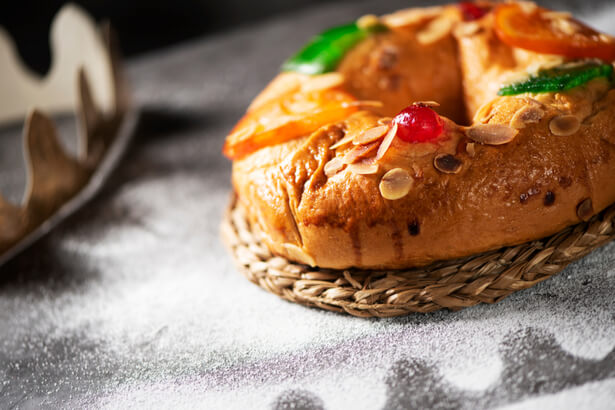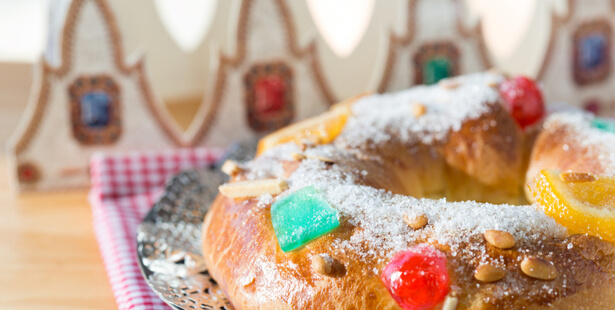 Cette brioche en forme de couronne, dans laquelle on glisse une pièce d’argent, une figurine de porcelaine ou un haricot sec, est décorée de fruits confits et d’amandes effilées et parfumée de zestes de citron et d’orange, brandy et eau de fleur d’oranger. Le « Roscon des Rois » peut aussi renfermer un ou plusieurs petits cadeaux. Des fruits confits et des bonbons sont aussi distribués aux enfants ce jour-là !