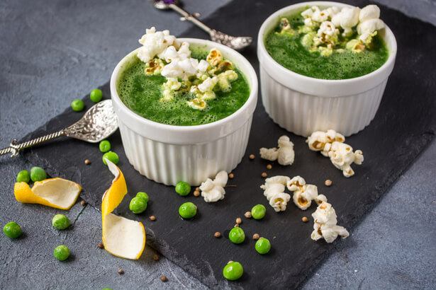 La préparation du velouté de petits pois et épinards au pop-corn citronné