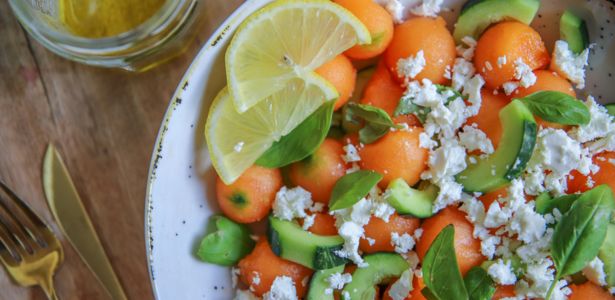 Commencez par couper le melon, les pêches et le concombre en cubes. Disposez-les dans un saladier. Ajoutez la feta également coupée en dés. Ciselez quelques feuilles de menthe et ajoutez-les à la salade. Arrosez d’un filet d’huile d’olive et de jus de citron, puis assaisonnez de sel et de poivre. Mélangez délicatement et servez bien frais.
