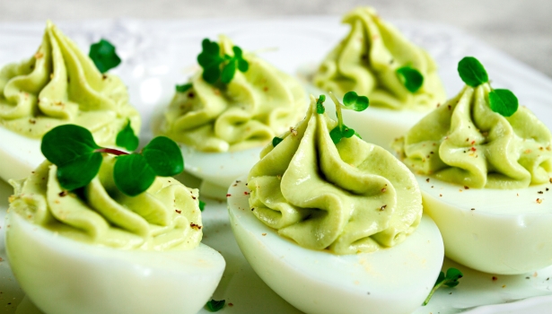 Coupez les oeufs en deux et récupérez les jaunes. Écrasez-les avec l’avocat, le jus de citron et la moutarde jusqu’à obtenir une texture crémeuse. Assaisonnez, puis garnissez les blancs avec cette préparation. Parsemez d’herbes fraîches et servez bien frais.