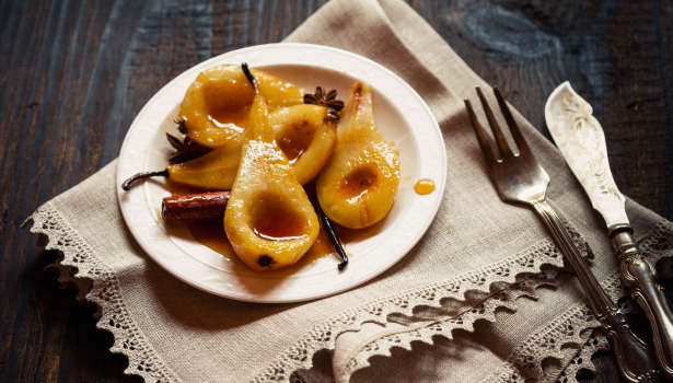 - Dessert fruité : poires pochées au vin et à la cardamome