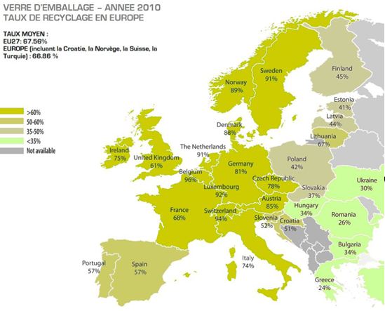 Le taux de recyclage du verre était de 58,7 % en France fin 2010, un peu en dessous de la norme européenne (60 %) et très loin derrière le taux de recyclage allemand, qui s’élève à 70 %.