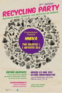 Au programme de la Recycling Party : New soul et Rock, avec la présence de la chanteuse Nneka et du groupe The Enjoys. A ces artistes viendra s’ajoutera un groupe élu par les internautes sur le site buzzmyband.com (début du vote en avril).