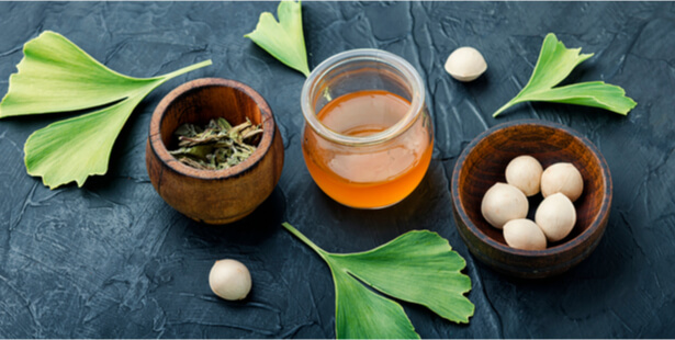 Graines et feuilles de ginkgo biloba en médecine végétale pour soulager les acouphènes © Lunov Mykola