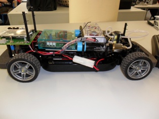 Au fond du plateau, deux élèves observent un panneau photovoltaïque souple, à côté de panneaux solaires classiques. Un élève joue avec une voiture télécommandée hybride hydrogène/électricité tandis qu’un drone est rangé dans un placard et un vélo à assistance électrique est posé dans un coin de la pièce.