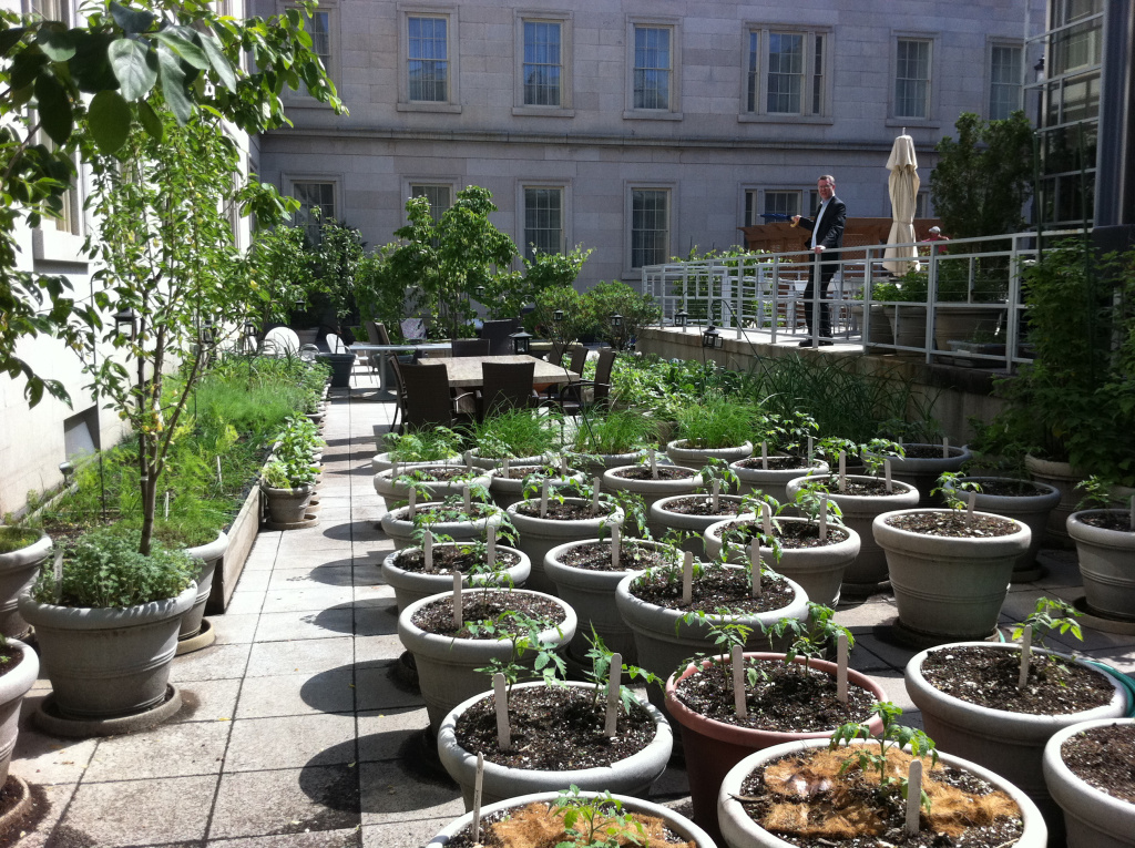 Poste Moderne Brasserie, à Washington. Original, le potager est situé dans l’espace de réception du restaurant ! Les convives peuvent se servir directement en tomates cerises et autres framboises pour garnir leurs assiettes. A ce jour, le restaurant cultive plus d’une douzaine de variétés de tomates, mais aussi des amandes, figues, pommes, cerises, asperges etc.