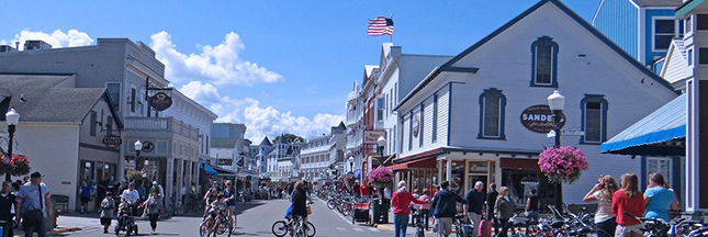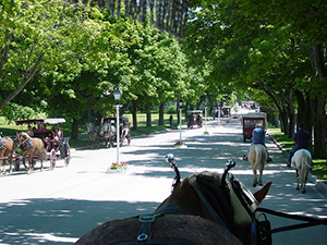 En réalité, on trouve quelques voitures, mais ils restent très limitées : des véhicules ambulanciers et des motoneiges pour l’hiver. Les autres déplacements en chariot tiré par des chevaux et puis bien sûr à pieds, en vélo, en roller, en skate… Fait amusant : la route d’Etat M-185, route de type highway fait le tour de l’île, mais elle est interdite aux voitures, seule exception aux Etats-Unis pour les routes de ce type.