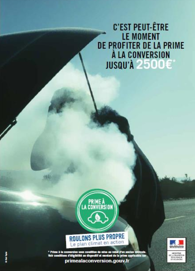 Pour encourager les ménages dans cette démarche de reconversion, Nicolas Hulot, le ministre de la Transition écologique et solidaire, vient de lancer une campagne de communication autour du dispositif. Sur l’une des affiches dévoilées aux journalistes, on voit ainsi une personne s’affairer devant le capot ouvert d’une voiture d’où se dégage un épais nuage de fumée. Le slogan se lit comme suit : « C’est peut-être le moment de profiter de la prime à la conversion jusqu’à 2.500 euros ».