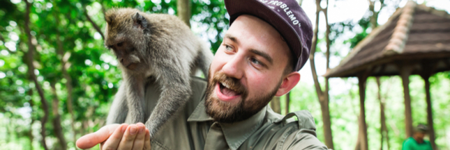 Illustration bannière : Un touriste prend un selfie avec un singe – © Yulia Manorova