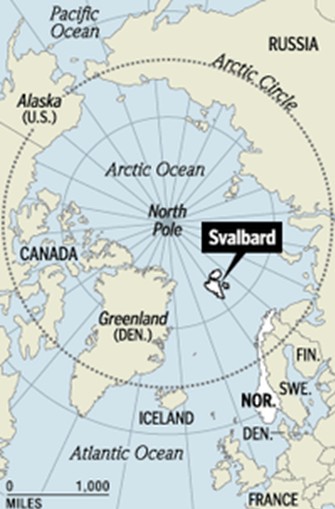 Elle se situe sur l’archipel du Svalbard. L’installation est fortifiée : elle comprend un long tunnel d’une centaine de mètres de long qui débouche sur 3 caves glacées (de 27m de long sur 9,5m, avec une surface de 256,1 m2), réfrigérées à -20°C.