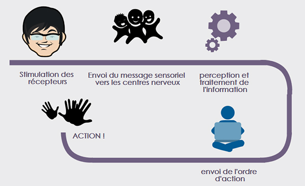 Ces trois types de récepteurs sont les premiers messagers du long circuit d’information qui donnera lieu à une action ordonnée par le système nerveux. Schématiquement, le circuit se présente comme cela :