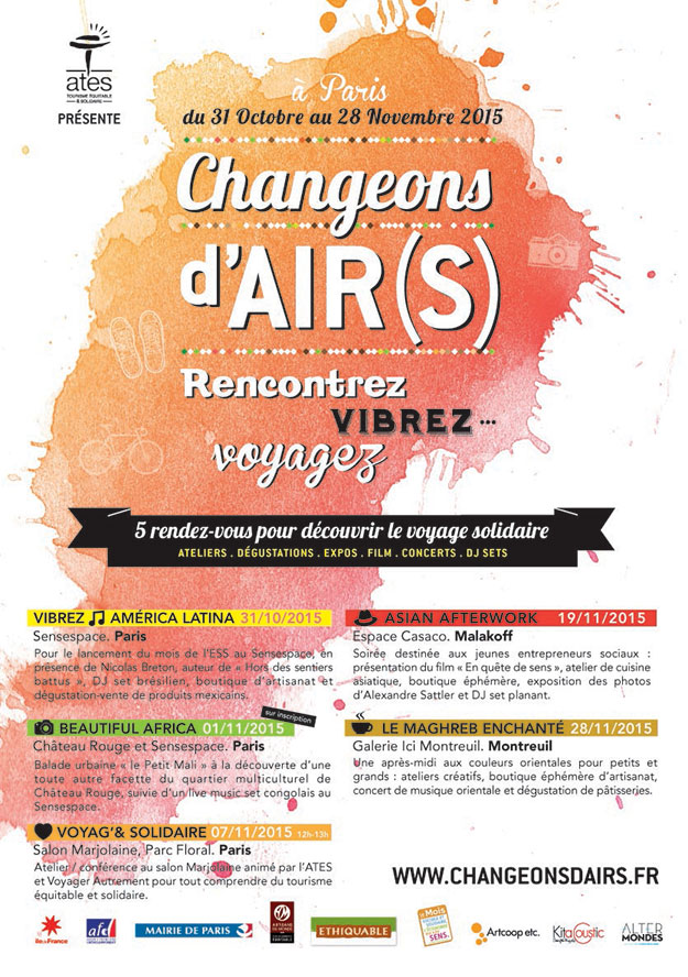 L’association, ATES, qui oeuvre pour le tourisme équitable et solidaire, a pour mission de sensibiliser le plus grand nombre au concept du tourisme équitable et solidaire. En partenariat avec une agence événementielle Artcoop, une coopérative d’artistes spécialiste de l’économie sociale et solidaire, l’ATES a imaginé un ensemble d’événements festifs et conviviaux autour des principales destinations des voyages équitables et solidaires.