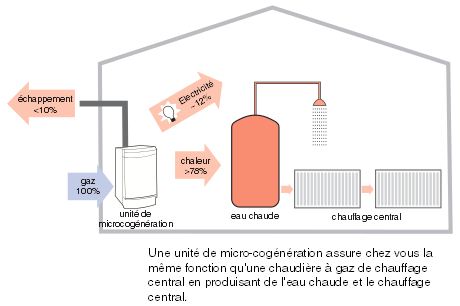 Une unité de micro-cogénération assure la même fonction qu’une chaudière à gaz de chauffage central en produisant de l’eau chaude et le chauffage central.