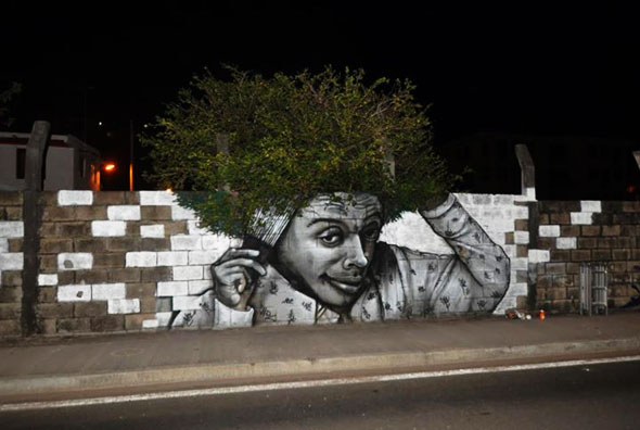 Les street artists utilisent les végétaux des villes comme partie intégrante de leurs oeuvres. Ici, l’artiste martiniquais Nuxuno se sert d’un arbre comme base comme chevelure pour son portrait.