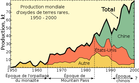 De plus, la main d’oeuvre y étant très bon marché, aujourd’hui la Chine détient très largement le monopole de la production de terres rares avec plus de 95 % de la production mondiale à elle seule.