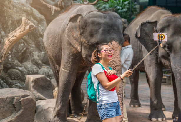 Une touriste fait un selfie devant les éléphants ©somdul Shutterstock