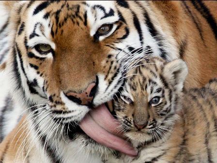 Le tigre de Sibérie ou encore tigre de l’Amour porte bien son nom à en croire cette photographie prise au zoo de Royev Ruchey en Russie montrant une femelle lécher son petit âgé de quelques semaines. Le tigre de Sibérie est aujourd’hui une espèce sévèrement en danger qui vit surtout en captivité dans les parcs animaliers.