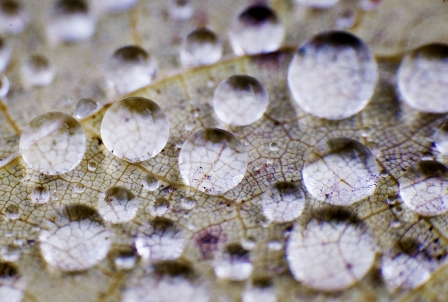 Vous pensiez que les gouttes d’eau ne faisaient que s’écraser mollement à la surface des feuilles végétales ? Il n’en est rien : un très gros plan comme celui-ci montre la beauté de ces petites bulles d’eau, comme délicatement posées.