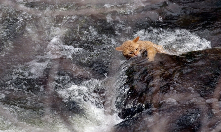 Voici un beau cliché qui peut également peiner. Sur l’image, un chat tentant de s’agripper et de grimper à un rocher pour échapper au rapide courant d’eau.