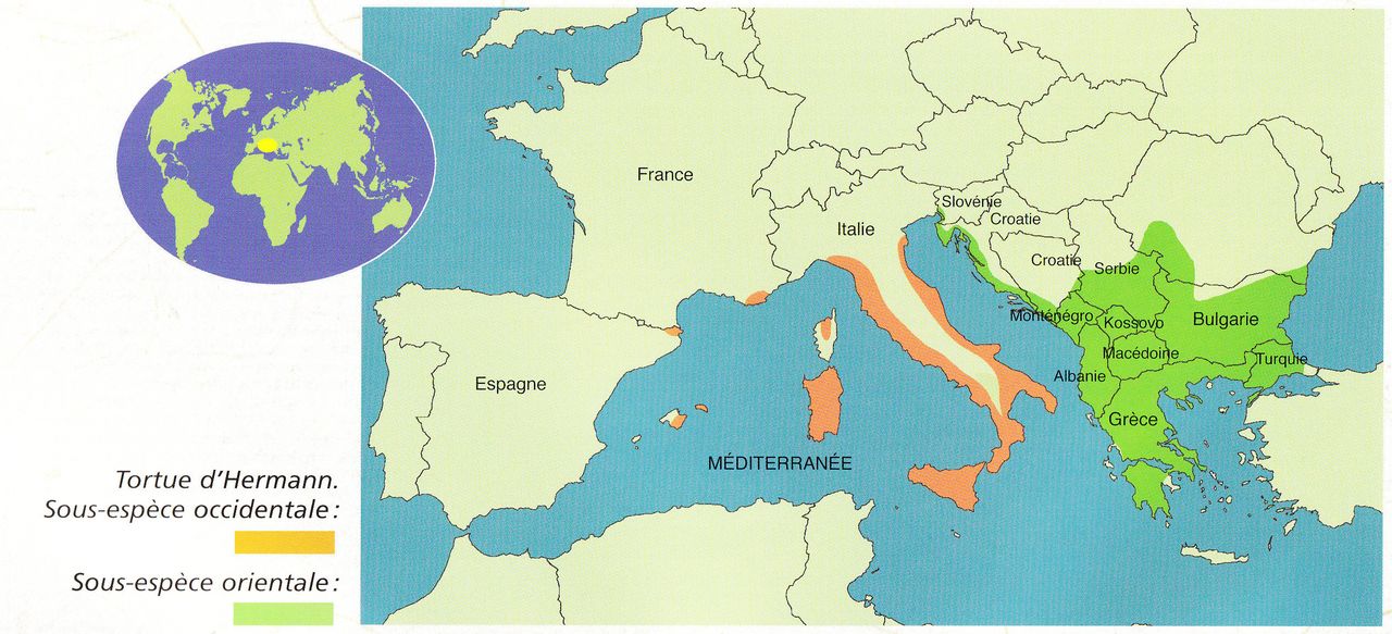 Aire de distribution mondiale de la tortue Hermann et de sa sous-espèce (d’après La Tortue d’Hermann, Ed. D’Orbestier, 2009) / tortue-hermann.eu