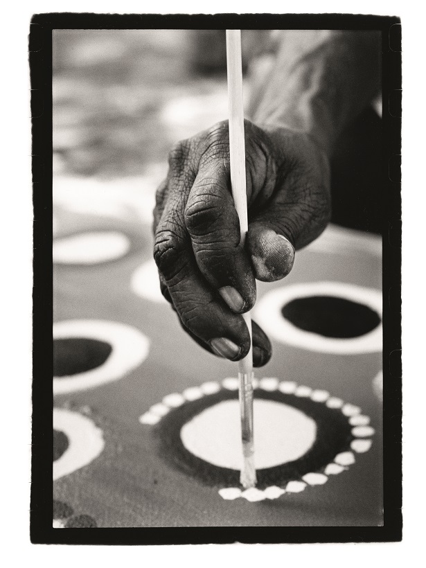 La main photographiée appartient à Susy Gilbert. Elle est aborigène et vit à Broome. « Elle aime que son pinceau glisse dans ces couleurs de terre et d’eau qui lui font penser à son pays d’origine », rapporte Anne de Vandière.