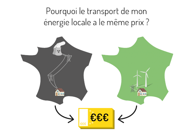 Les coûts du transports vers les foyers français sont financés par le TURPE, le Tarif d’Utilisation des Réseaux Publics d’Électricité, payé soit indirectement via la facture de l’électricité pour les petits consommateurs, soit directement au gestionnaire de réseau dans le cas d’un contact direct avec le gestionnaire de réseau pour les plus gros consommateurs en général. Mais pour Fermetacentrale, son calcul est injuste et n’encourage pas la transition énergétique.