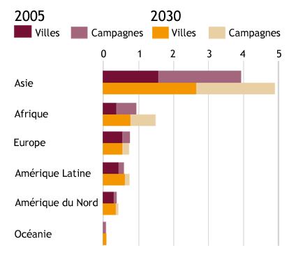 - La croissance des villes africaines devrait être de + 590 % entre 2000 et 2030 ! Les 5 zones les plus touchées sont : le golfe de Guinée, autour du Nil en Égypte, les rives nord du lac Victoria, le nord du Nigeria, la région d’Addis-Abeba en Éthiopie