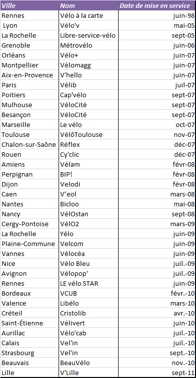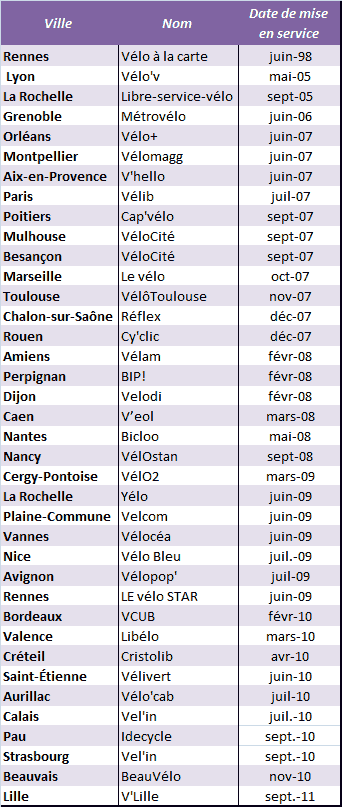 Il manque Pau dans votre liste des villes (depuis l’été 2010): IDEcycle. A noter que l’abonnement est réduit de moitié pour les titulaires d’un abonnement « bus ». En outre, est associé un service d’autopartage (avec de la même manière abonnement à moitié prix).