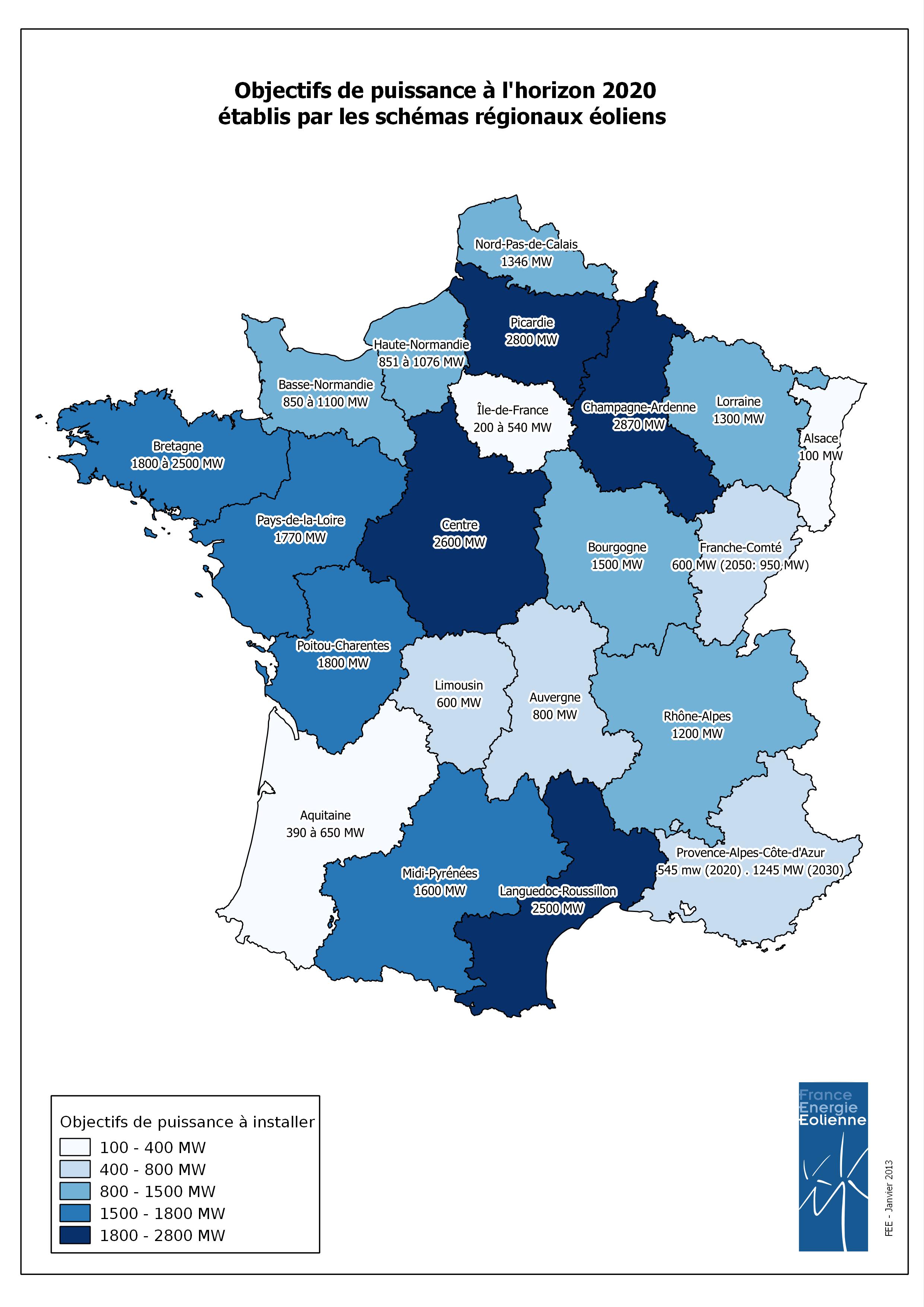 Pour atteindre les objectifs fixés par le Grenelle Environnement (puissance installée fin 2012 : 11 500 MW), il faudra installer environ 1 800 MW en moyenne annuelle alors qu’environ 757 MW ont été installés et raccordés en 2012. Il faut donc accélérer le rythme des installations d’éoliennes.